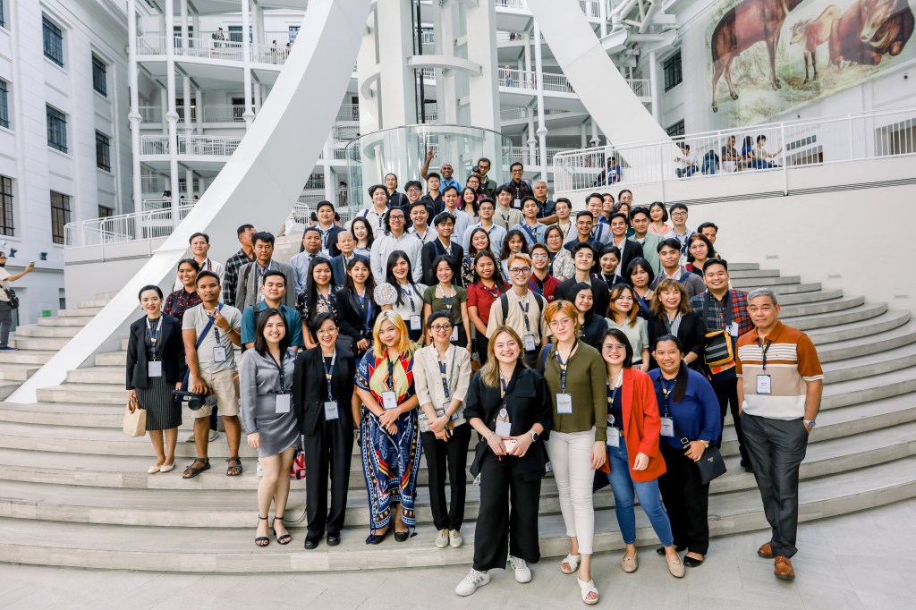 Tree of Life. The ASEAN Center for Biodiversity staff (front-bottom row), the ASEAN Biodiversity Heroes and ASEAN Young Storytellers (mostly back-top row), and the development communication students and teachers (mostly in the middle) strike a pose below the “Tree of Life” monument at the center of the National Museum of Natural History on August 11, 2023, in Manila, Philippines. Photo from the ASEAN Center for Biodiversity.