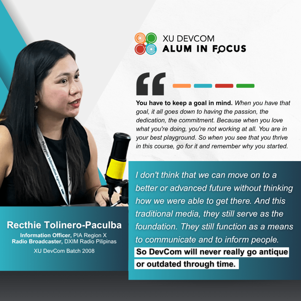 Recthie Tolinero-Paculba, a graduate of XU Development Communication, sees her course not merely as an academic program, but as the foundation that shaped her personal and professional identity. Her varied interests—photography, writing, and broadcasting—come together to make her career dynamic and deeply meaningful.