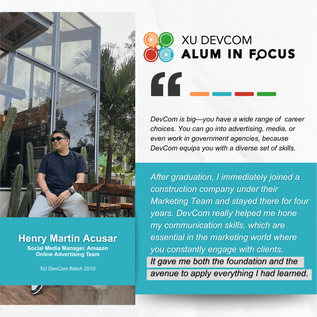 A 2010 graduate of BS Development Communication at Xavier University – Ateneo de Cagayan, Henry recalls the shift clearly. “Back then, I really wanted to pursue architecture. I loved drawing, and I had taken a civil tech pre-course. But things changed. Eventually, DevCom became a first choice.”